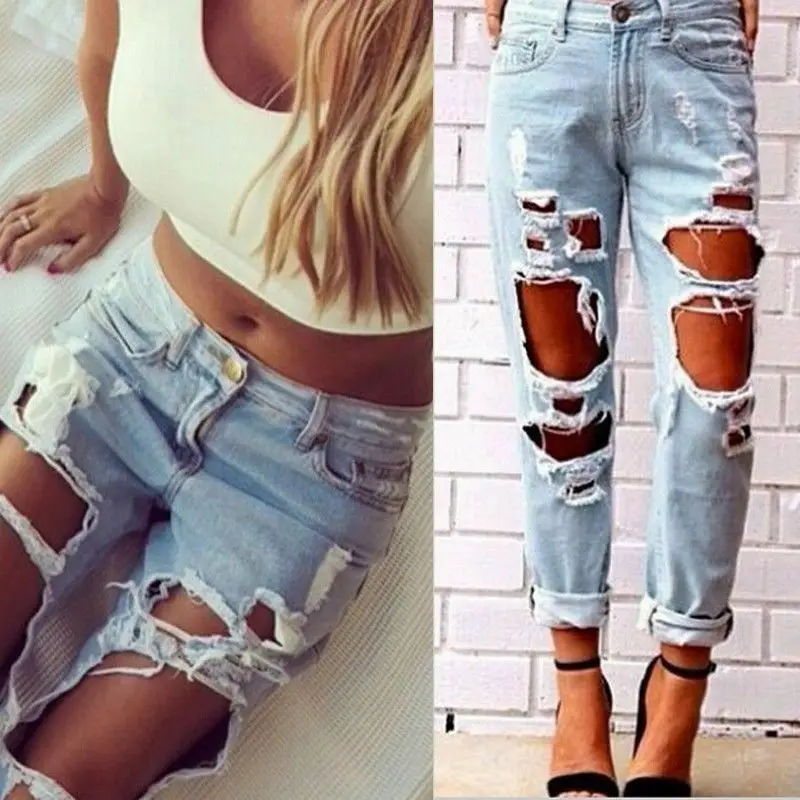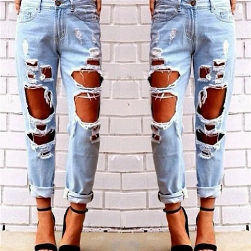 2019 Newest Style Women's Sexy Women's Summer Waist High Pants Jeans Destroyed Torn Cool Slim Pants Jeans Blue Pants