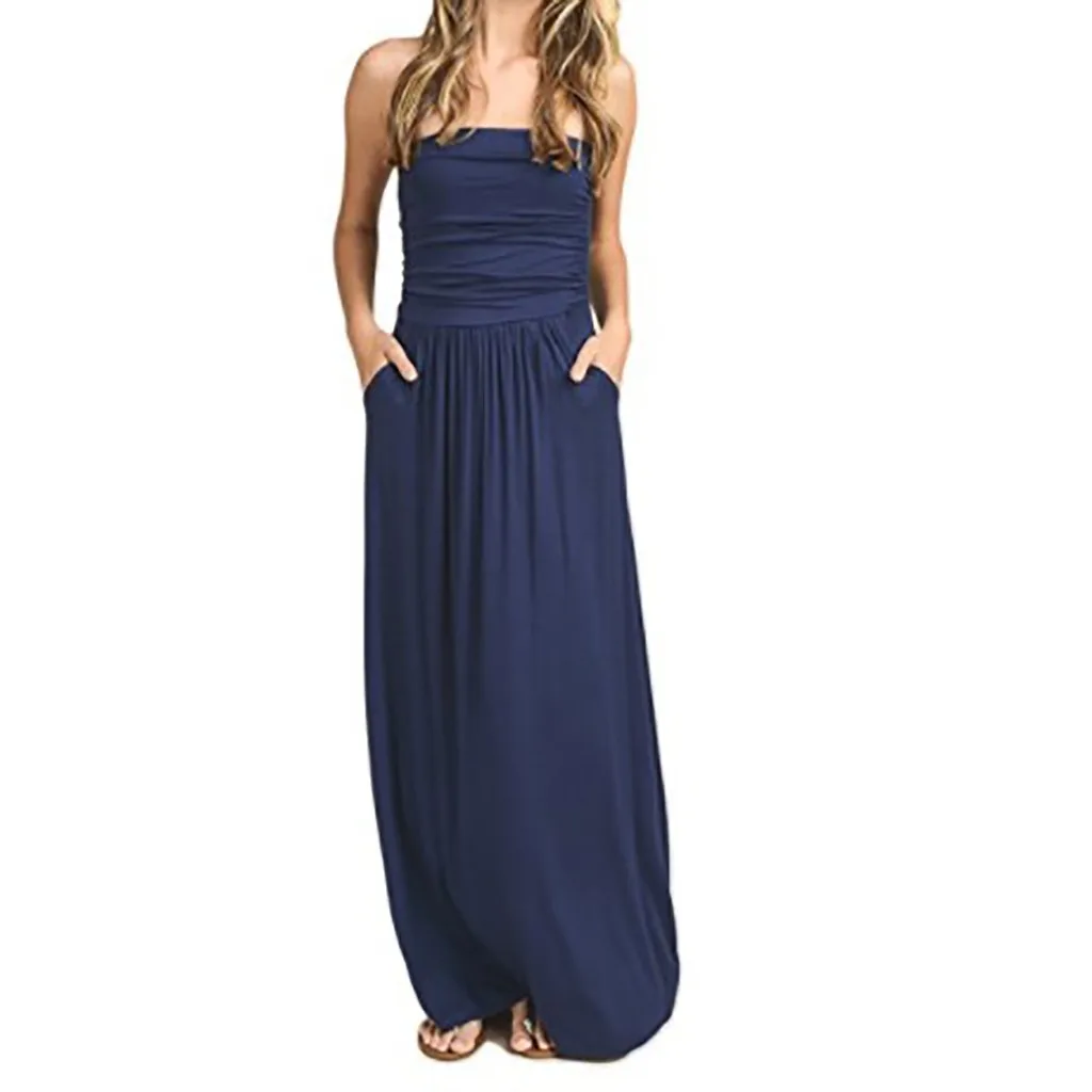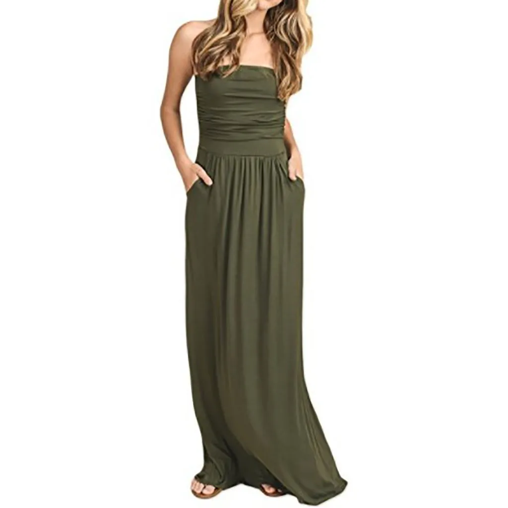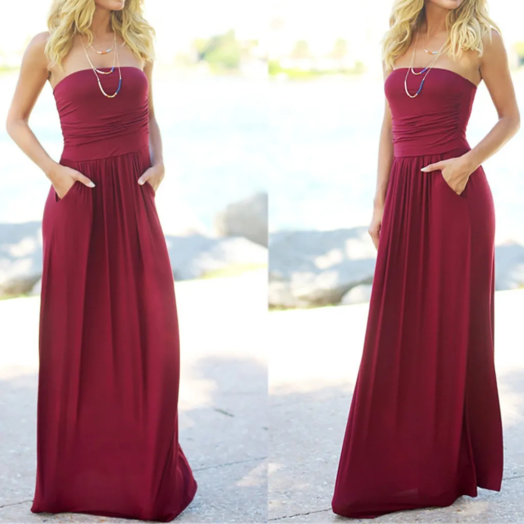 Boho style Maxi Dress Women Sexy Strapless off shoulder Solid Color Summer High Waist Long Pockets Casual Beach dress Vestidos